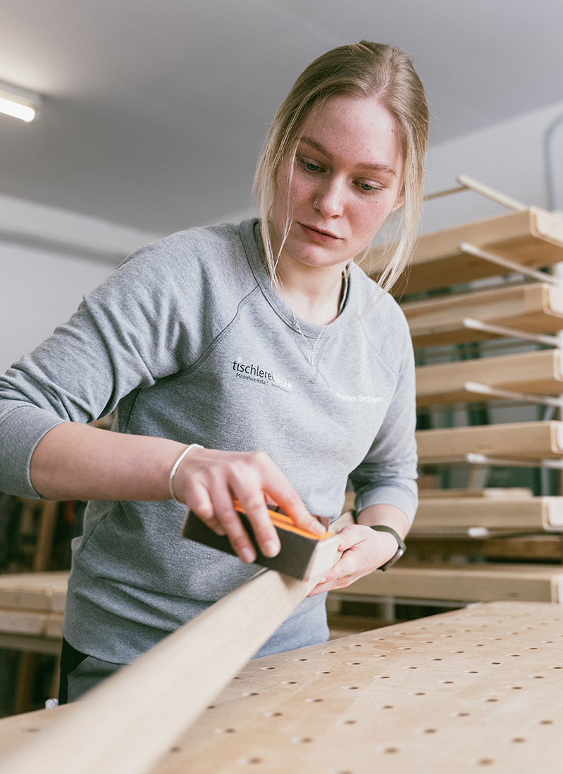 „Tischlerbetriebe bilden sehr gerne aus, auch weil wir weiterhin gute Fachkräfte brauchen.“, betont Obermeister Bröker. Die Tischer-Ausbildung findet im dualen System statt, das heißt parallel im Ausbildungsbetrieb und in der Berufsschule. Zusätzlich dazu gibt es überbetriebliche Lehrgänge. Im Schulunterricht lernt der Azubi die Materialien, Arbeitsverfahren, Technologien und handwerklichen Konstruktionen noch besser kennen. Es wird auch das Lesen und Erstellen von Skizzen und Zeichnungen sowie das notwendige mathematische Rüstzeug vermittelt. Vor Beginn einer Ausbildung im Tischler-Handwerk empfiehlt es sich, ein Praktikum in einer Werkstatt zu absolvieren, um festzustellen, ob Erwartungen und Realität übereinstimmen. So hat es auch Madlen Beckmann, Tischler-Auszubildende im 2. Lehrjahr bei der Tischlerei Beule aus Brilon gemacht. „Nach meinem Fach-Abitur mit dem Schwerpunkt Kunst habe ich mich bewusst für eine Ausbildung als Tischlerin entschieden. Ich wollte unbedingt etwas mit meinen eigenen Händen schaffen und stolz darauf sein, was ich eigenständig erstellt habe“, berichtete Madlen Beckmann. „Dass ich meine Kreativität im Tischler-Handwerk ausleben kann, ist mein besonderes Highlight während meiner Ausbildung. Aber auch der Grundlehrgang zu Beginn der Ausbildung, wo wir die Grundlagenfertigkeiten, den sicheren Umgang mit Maschinen und die Veredelung von Oberflächen gelernt haben, hat mir direkt gezeigt, hier fühle ich mich wohl, das möchte ich machen.“