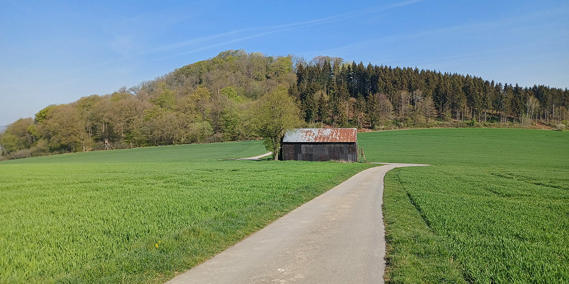 Wir gehen los, entlang der Kelbke, zurück nach Calle, vorbei am Hunstein und der Caller Kirche, über den Kreuzweg hinauf zur denkmalgeschützten Halloh-Kapelle. Darin befinden sich Krücken, die von Gehbehinderten stammen sollen, die dort auf wundersame Art und Weise spontan geheilt wurden. Die Kapelle ist nicht nur das Ziel des Kreuzwegs von Calle, sondern auch der drei Kreuzwege von Niederberge, Oberberge und Wallen. Außerdem haben wir Aussicht auf die Berge, die wir als Nächstes besteigen. Im Frühling blicken wir hier über das Gelb eines Rapsfeldes oder Wiese voller Löwenzahn hinweg.