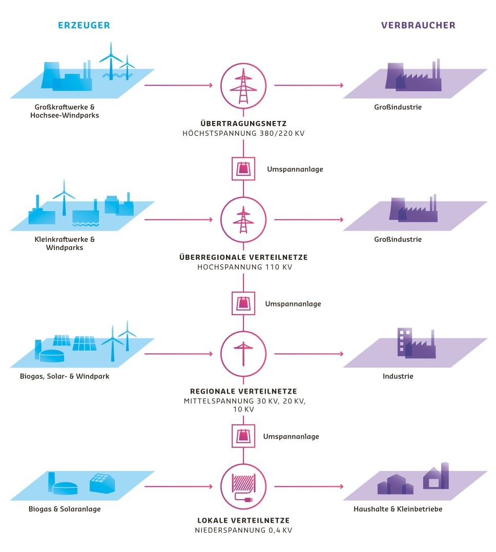 In Deutschland gibt es vier Übertragungsnetzbetreiber: Amprion GmbH, TransnetBW GmbH, 50Hertz Transmission GmbH und Tennet TSO GmbH. Daneben sind knapp 1.000 Verteilungsnetzbetreiber registriert. Die großen Übertragungsnetze transportieren den Strom über Höchstspannungs- (380 KV) und Hochspannungsleitungen (110 KV). Die regionalen und lokalen Verteilungsnetzbetreiber liefern über Mittel- und Niederspannungsnetze den Strom unter anderem in die Haushalte.