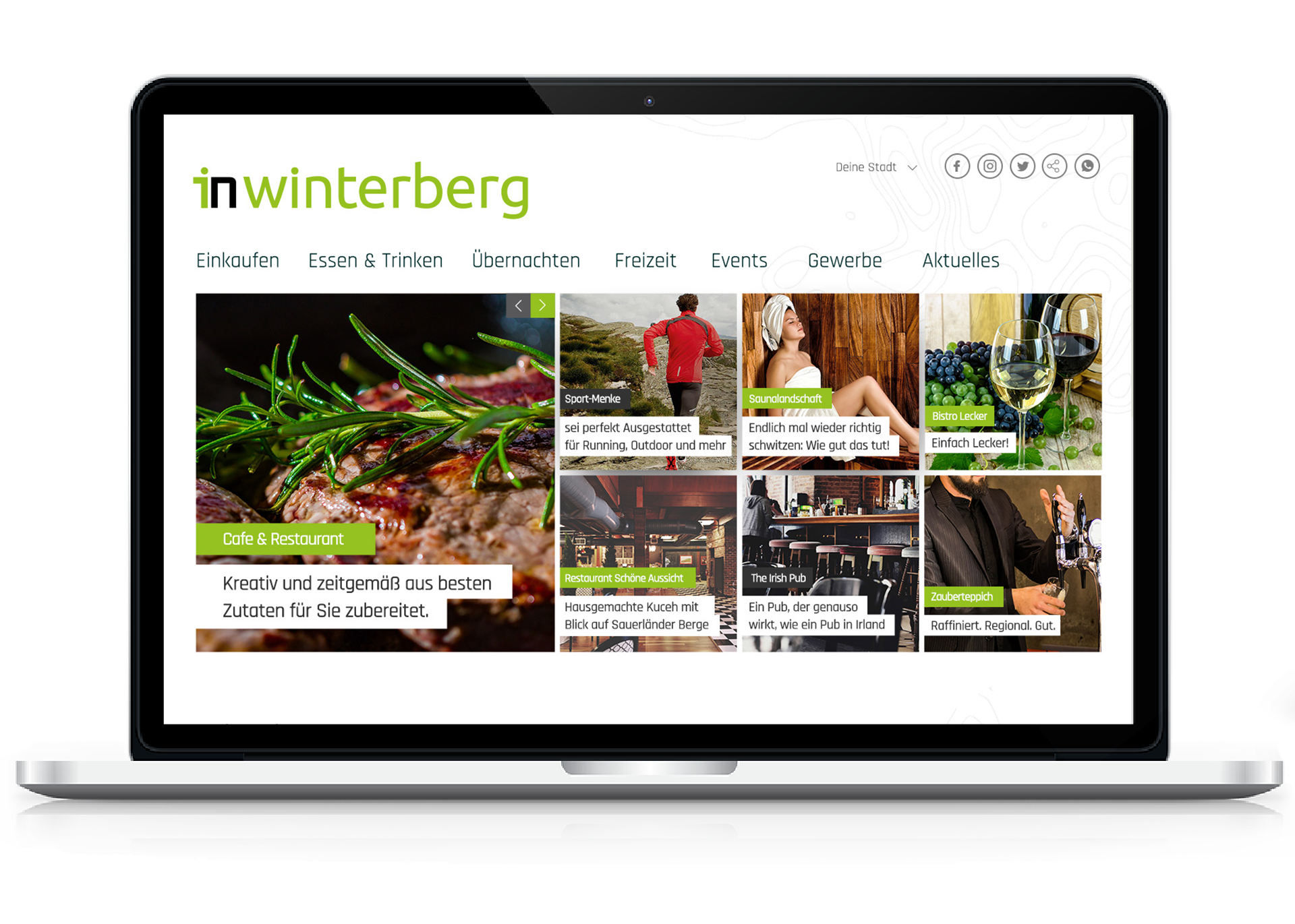 Herausgekommen ist ein für Smartphones und Tablets optimiertes Portal, das die Interessen von Gästen und Einheimischen vereint. Rubriken wie Aktuelles, Einkaufen (Einzelhandel, Dienstleistungen, Handwerk und Industrie), Essen & Trinken, Freizeit, Events und Übernachten informieren die Besucher des Internetportals rund um Winterberg. In 2019 folgen zusätzlich die Rubriken Jobs und Wohnen.